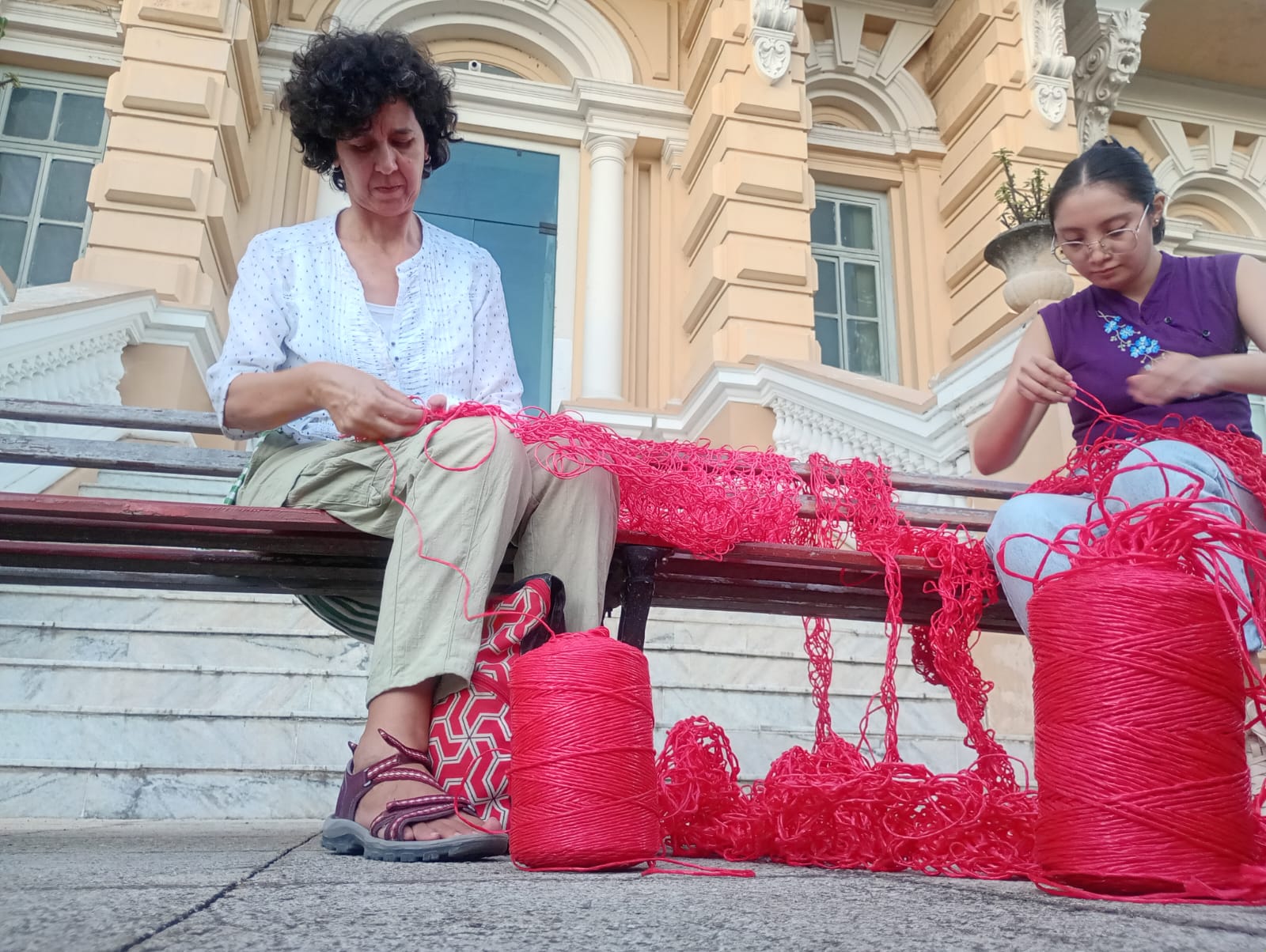 Mujeres de distintas edades y procedencias se reunieron a las afueras del Museo Regional de Antropología Yucatán Palacio Cantón para desarrollar la actividad TEJER EN ROJO: Conciencia hilada, la cual buscó conectar a las participantes y generar reflexión en torno a la violencia de género. Dentro del marco del Día Internacional de la Eliminación de la Violencia contra la Mujer se realizó esta acción de 17 a 19 horas en dicho museo y se trasladó de 19 a 21 horas al Foro Cultural y Restaurante Amaro.