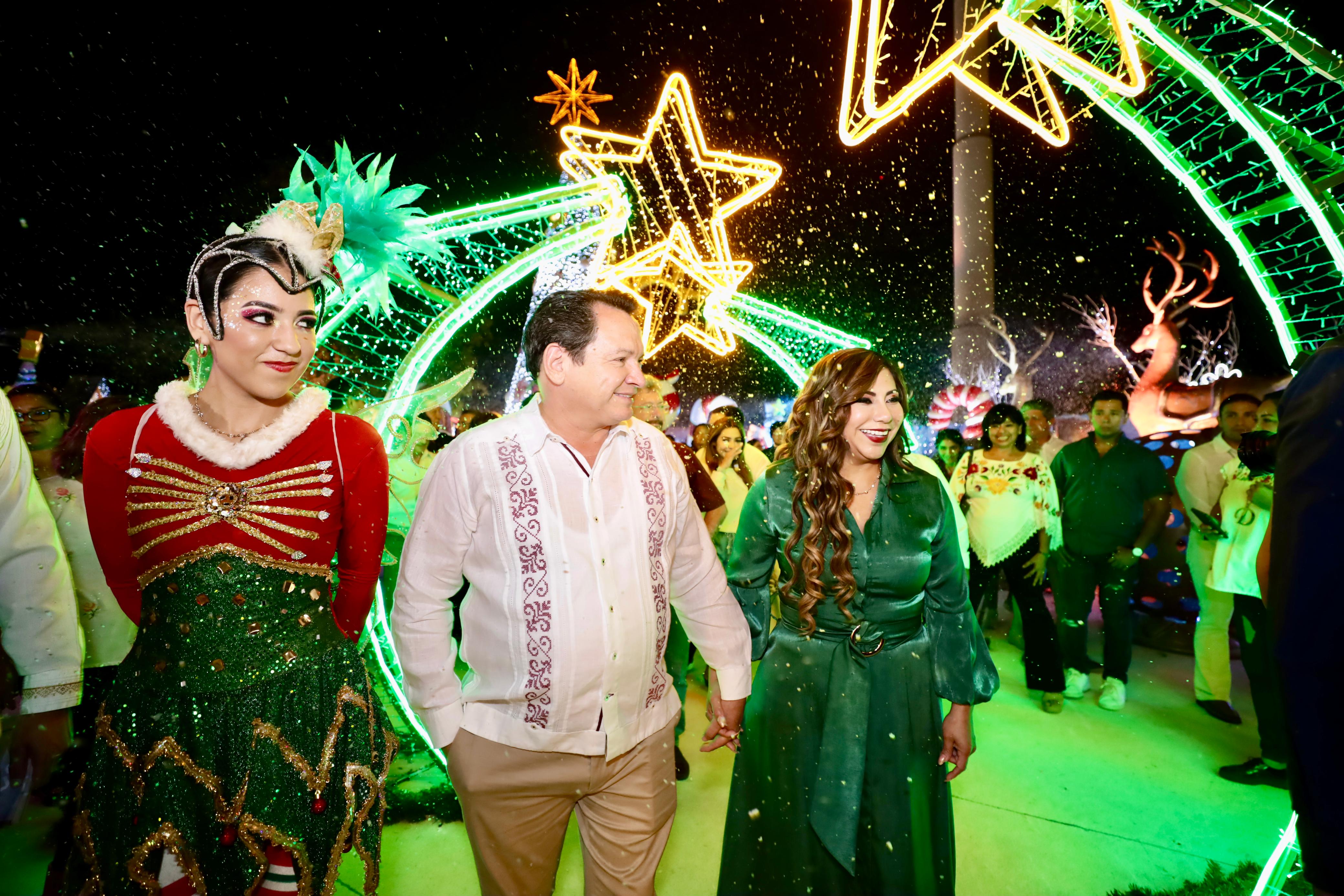 El Gobernador Joaquín Díaz Mena, junto a su esposa, y presidenta honoraria del Sistema para el Desarrollo Integral de la Familia (DIF) Yucatán, la maestra Wendy Méndez Naal, inauguró esta noche la Villa Navideña del Gobierno del Estado en el parque de La Plancha, con el propósito de ofrecer a las familias yucatecas un espectáculo que celebra la magia de la Navidad.