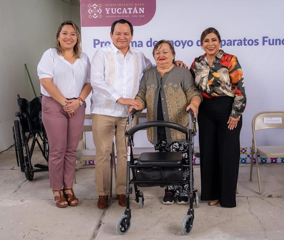 Díaz Mena asistió a las oficinas centrales del Sistema para el Desarrollo Integral de la Familia (DIF) Yucatán para hacer entrega de 48 aparatos de movilidad a personas con discapacidad.