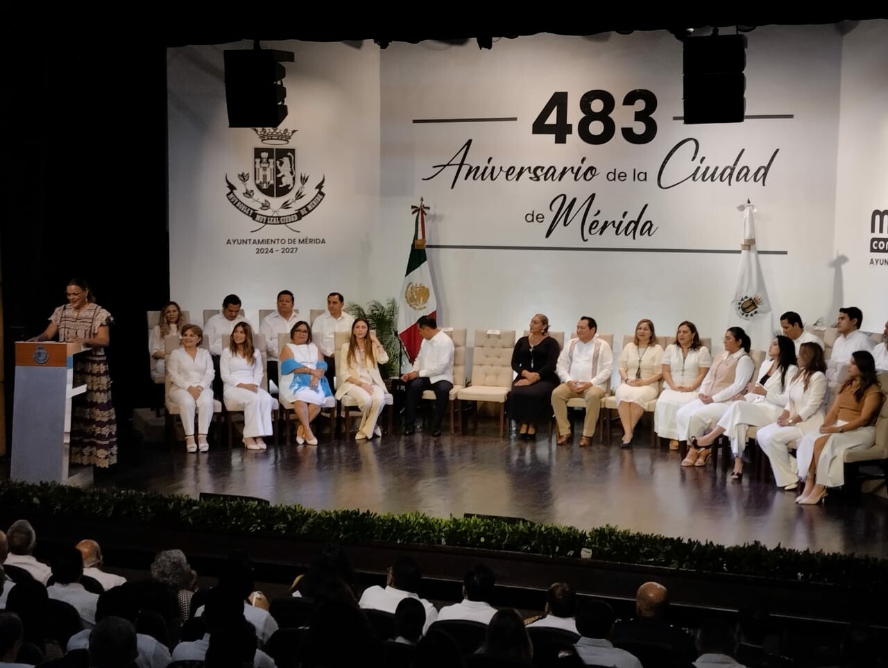 Autoridades del ayuntamiento de Mérida y representantes de los poderes Ejecutivo, Legislativo y Judicial de Yucatán participaron en la sesión solemne de cabildo con motivo del 483 aniversario de la ciudad de Mérida. La anfitriona, presidenta municipal de Mérida, Cecilia Patrón Laviada, y la oradora huésped, Conchi León, dramaturga y docente, destacaron en sus respectivas intervenciones el protagonismo de las mujeres en la historia de la capital, así como el apoyo a la cultura como uno de los temas a trabajar para el gobierno municipal.