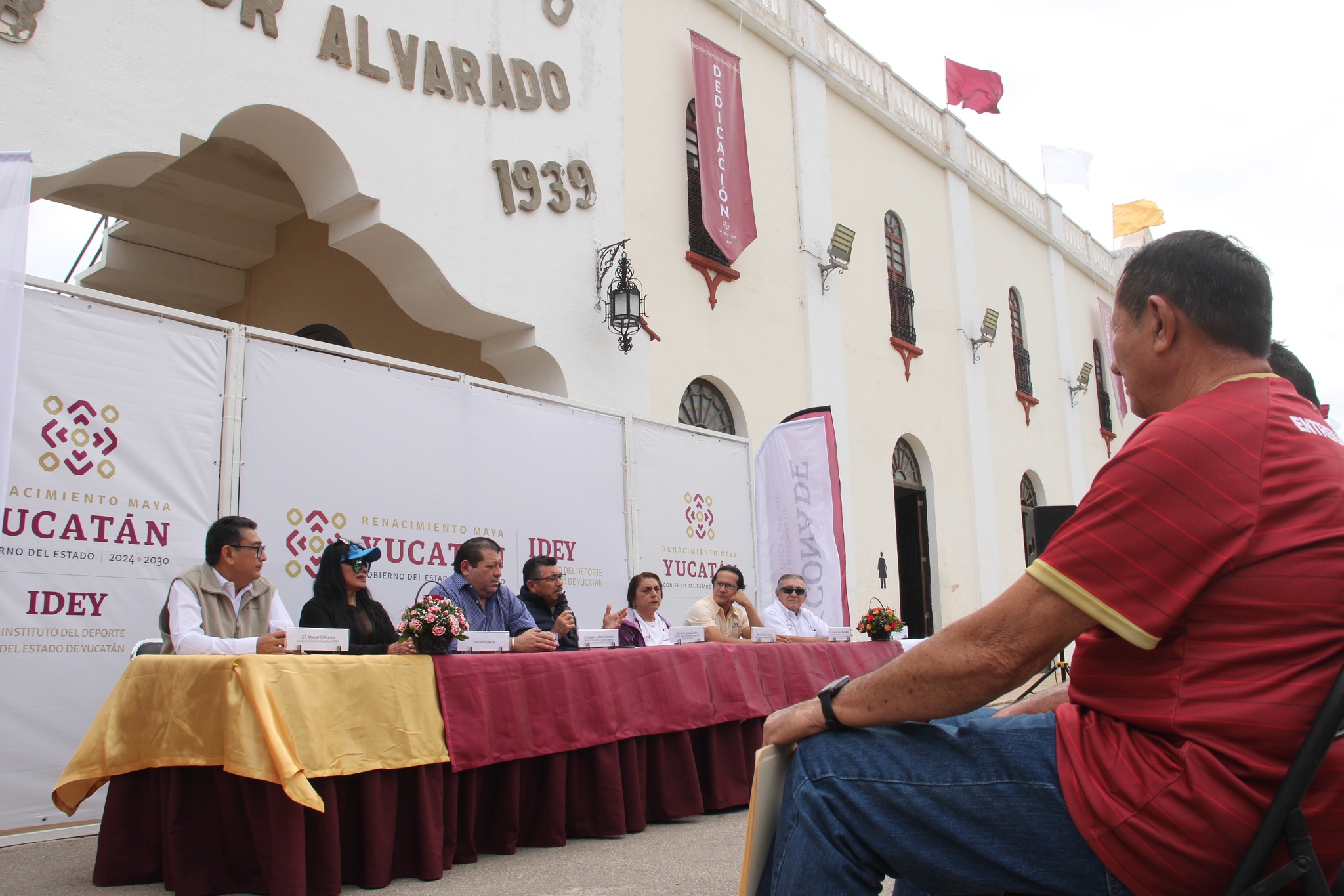Armin Lizama Cordova, director del Idey acompañado por Johansen Macías Medina, representante de la Asociación Civil "Acciones Deportivas de los Amigos del Estadio"; Leonel Macías Sánchez, director de promoción deportiva y principal promotor de los festejos y Gisele Ordaz Tamayo, administrador de esta unidad deportiva, hicieron la presentación oficial de los festejos que como cada año, comenzarán a las 4:30 horas con el encendido del fuego nuevo en la Plaza Principal de Mérida y será portado en una antorcha por los corredores mañaneros hasta llegar al recinto de la colonia Yucatán para encender el pebetero a las 5:00 horas y comenzar los festejos.