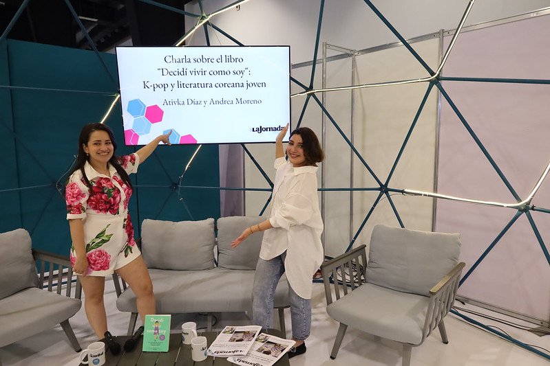 Las creadoras de contenido Ativka Díaz y Andrea Moreno charlaron en el stand de La Jornada Maya sobre k-pop y literatura coreana reciente, el libro Decidí vivir como soy, de la autora Kim Suhyun y también sobre la apuesta de la editorial Océano hacia estas escritoras y su perspectiva de entender el género y los problemas socioculturales de Corea.