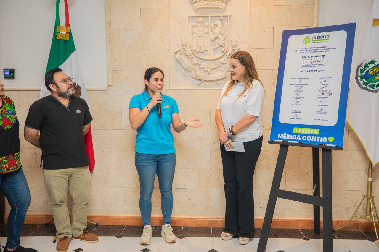 La presidenta municipal de Mérida, Cecilia Patrón Laviada, firmó la carta compromiso Tarjeta Mérida Contigo con empresas socialmente responsables, para que las personas mayores y con discapacidad accedan a productos y servicios que mejoren su calidad de vida.
