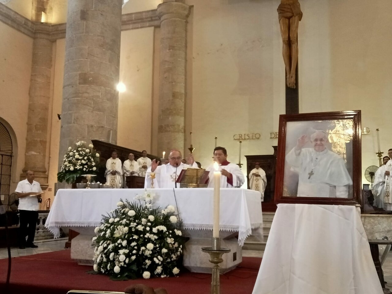 papa Francisco a los 88 años de edad. Es por ello que la Arquidiócesis de Yucatán celebró una misa en la Catedral de Mérida a las doce del mediodía con la presencia de varios sacerdotes y con los obispos auxiliares, Pedro Mena y Mario Medina Balam.