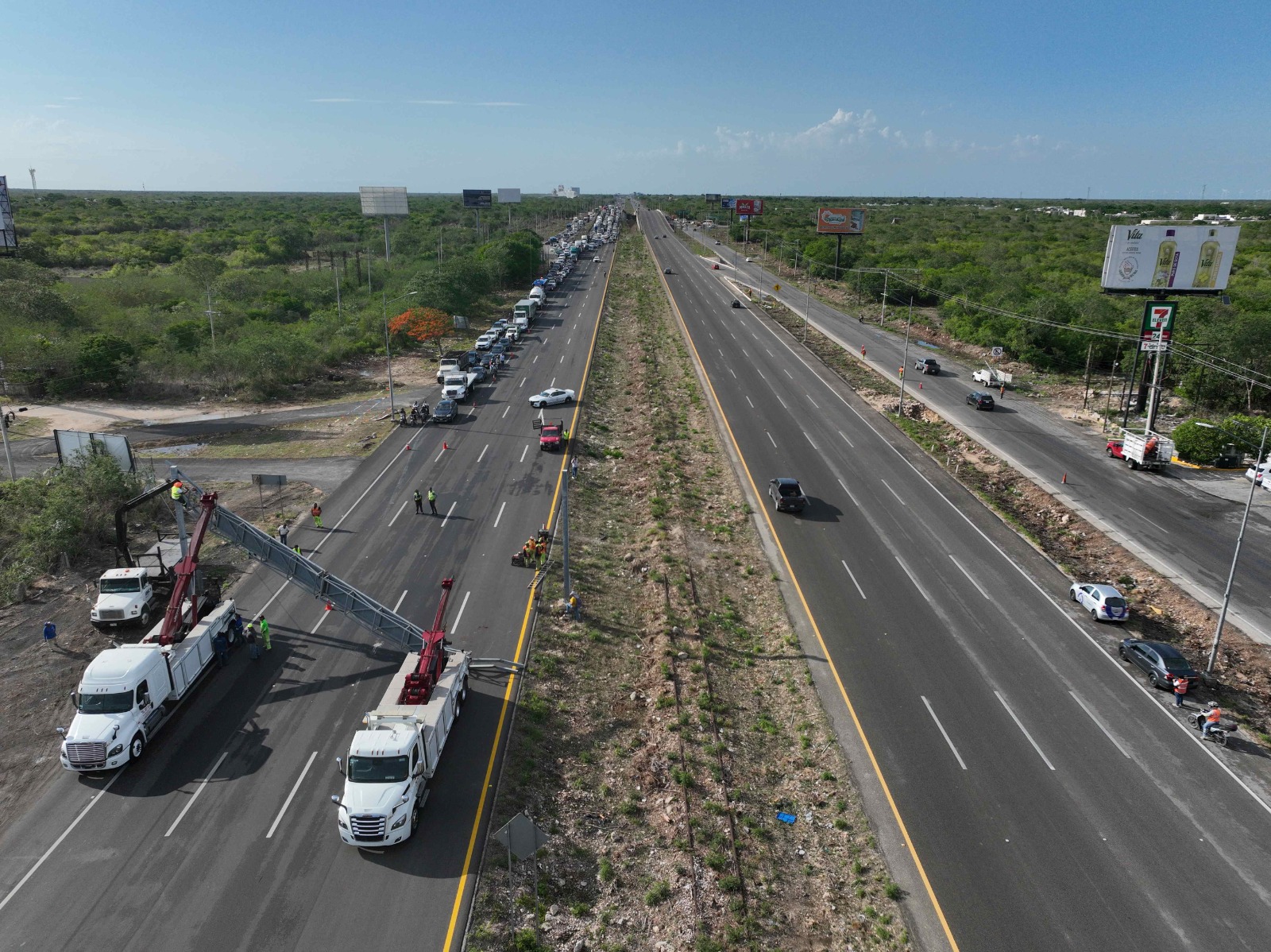 Ante el reporte de la caída de una estructura de señalamiento tipo puente ubicado en el kilómetro 14.5 del cuerpo B de la carretera federal Mérida – Progreso, provocado por la lluvia y el viento, la SICT en Yucatán en coordinación con elementos de la Guardia Nacional y la Secretaría de Seguridad Pública de Yucatán, llevaron a cabo un operativo para el retiro de la estructura apoyados con personal de las cuadrillas a cargo de los trabajos de conservación rutinaria en la zona.