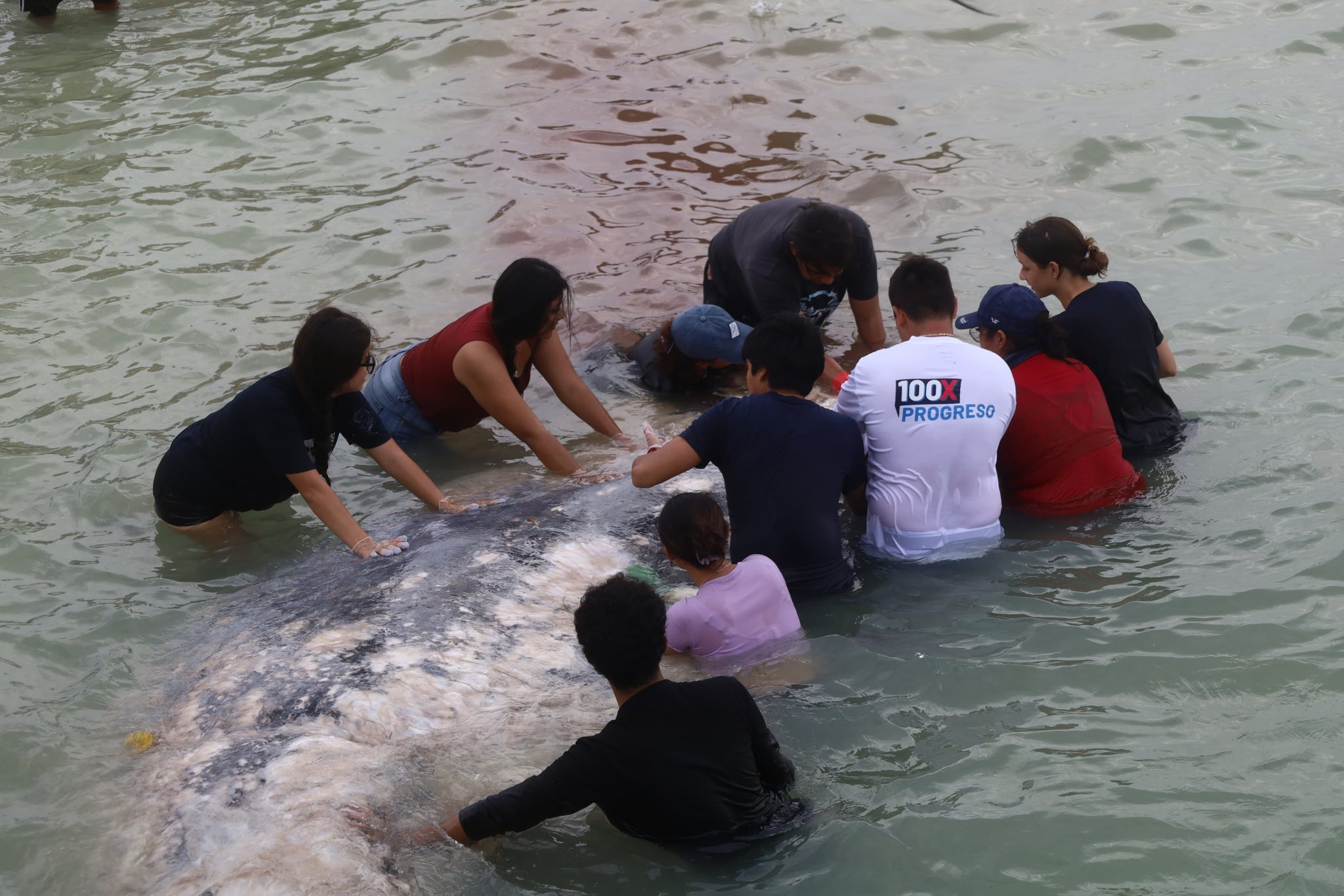 Otra de las instancias que participó en las labores de recalado fue la Unidad de Control y Protección Animal; Geovani Zapata, titular de la Unidad, brindó apoyo a jóvenes miembros del Programa de Investigación y Conservación de Mamíferos Marinos de Yucatán (Picmmy) de la UADY durante su primer contacto con el especimen de aproximadamente 9.5 metros de largo y 3 metros de ancho