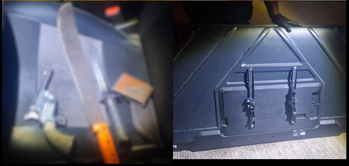 Al acudir al lugar, la unidad policial localizó un automóvil Chevrolet Aveo color rojo y procedió a marcarle el alto para realizar una inspección. Durante la revisión se encontraron armas blancas, una réplica de arma de fuego tipo pistola de aire comprimido, una pantalla de televisión de 65 pulgadas cuya procedencia no fue acreditada, así como una bolsita con mariguana, 36 pastillas de benzodiacepinas y dos teléfonos celulares.