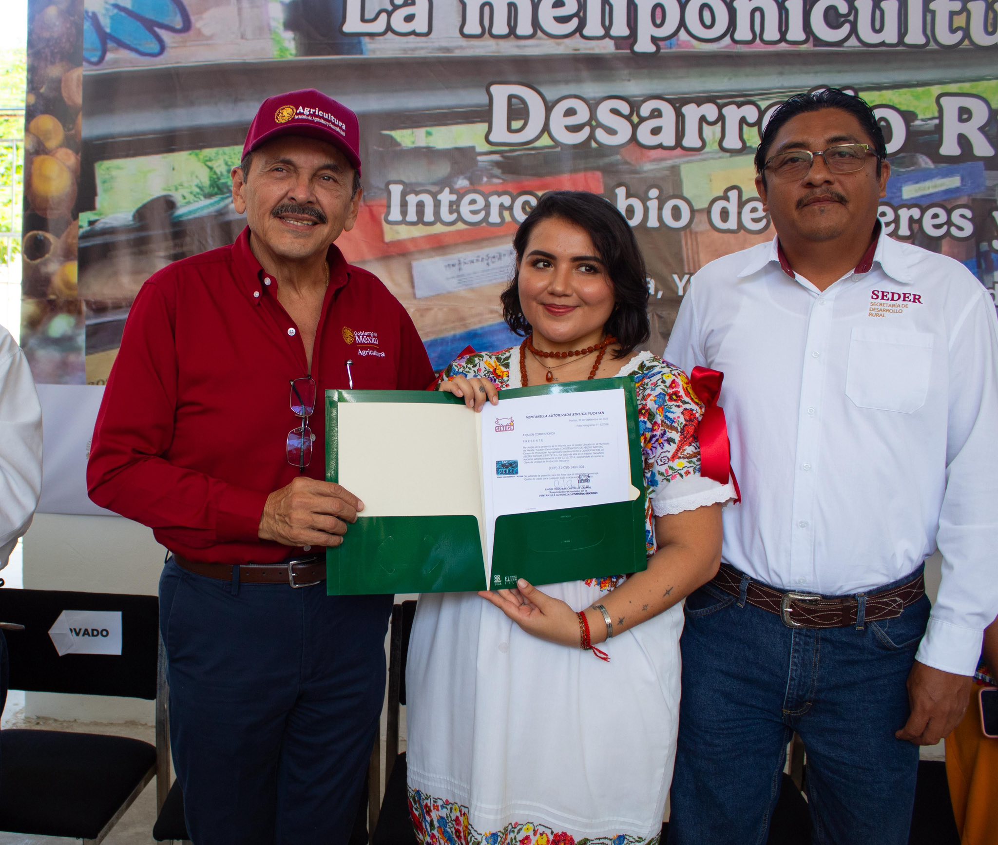 También estuvieron presentes productoras que dieron voz al sentir de las comunidades meliponicultoras. Ediht Chan Lara, de la Asociación “Holcaab” Centro de Producción Agropecuaria y productora de miel melipona del municipio de Temozón Sur, expresó que: “El alma de los antepasados está contenta hoy, porque se le está haciendo justicia a la abeja nativa de Yucatán. Esperamos que este beneficio llegue a las comunidades donde está su hábitat, a los pequeños productores que refrendamos que existimos”.