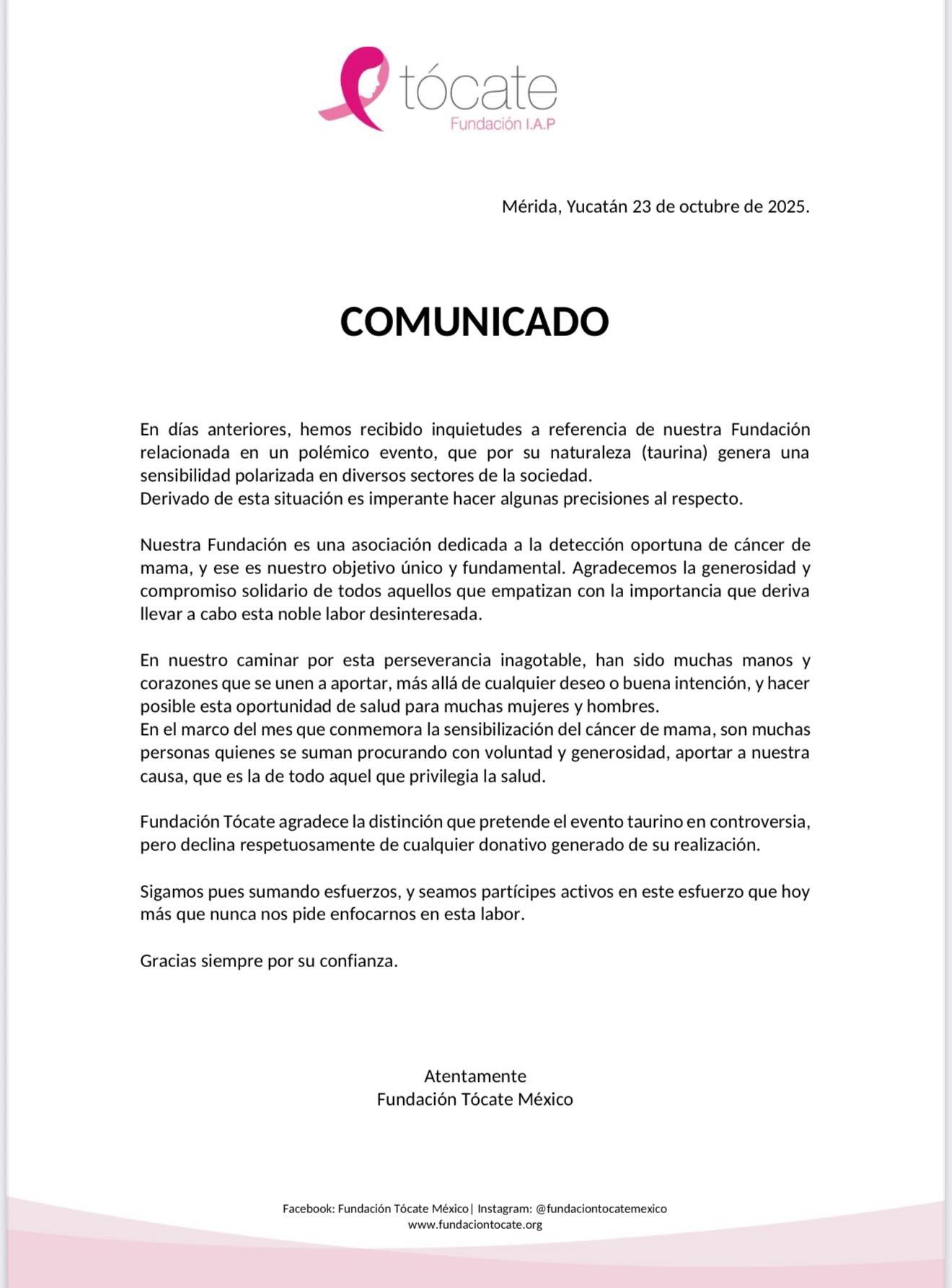 “Fundación Tócate agradece la distinción que pretende el evento taurino en boga, pero declina respetuosamente de cualquier donativo generado de su realización. Sigamos pues sumando esfuerzos y seamos partícipes activos en este esfuerzo que hoy más que nunca nos pide enfocarnos en esta labor”, señaló el comunicado en respuesta al ofrecimiento empresarial.