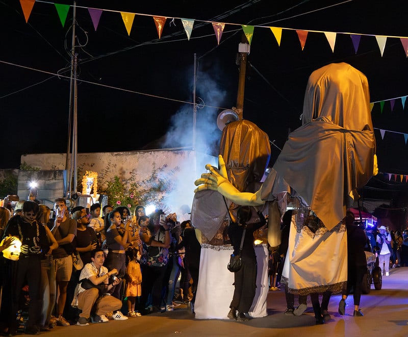 En esta edición, nuevas experiencias transformaron el recorrido en una vivencia única. El Portal del Inframundo, una proyección láser, convirtió la entrada del Cementerio General en un paso simbólico desde el mundo de los muertos, y la pareja de Mojigangas, dos calaveras de cuatro metros de altura que abrieron paso anunciando al público la llegada de las ánimas.