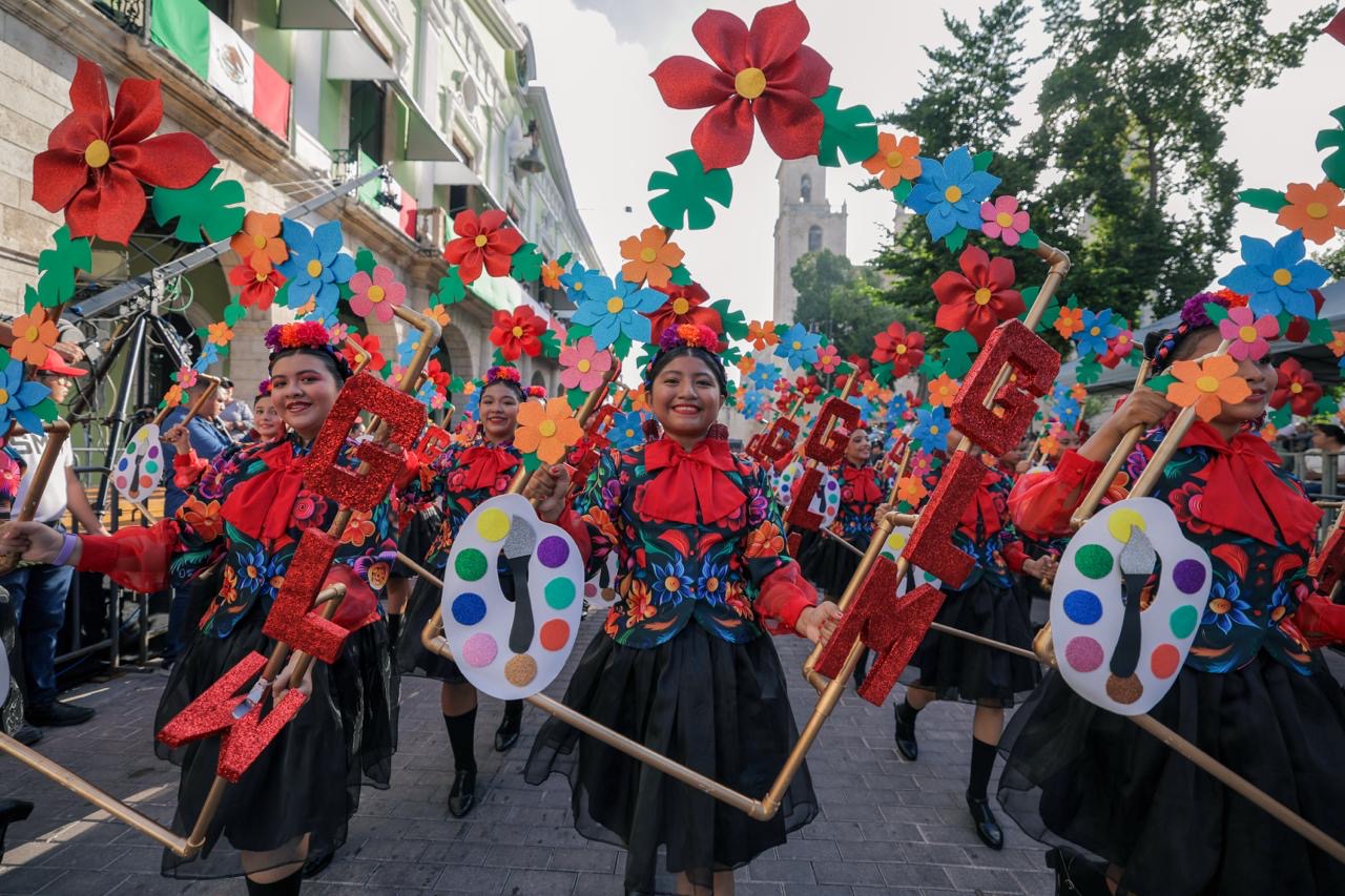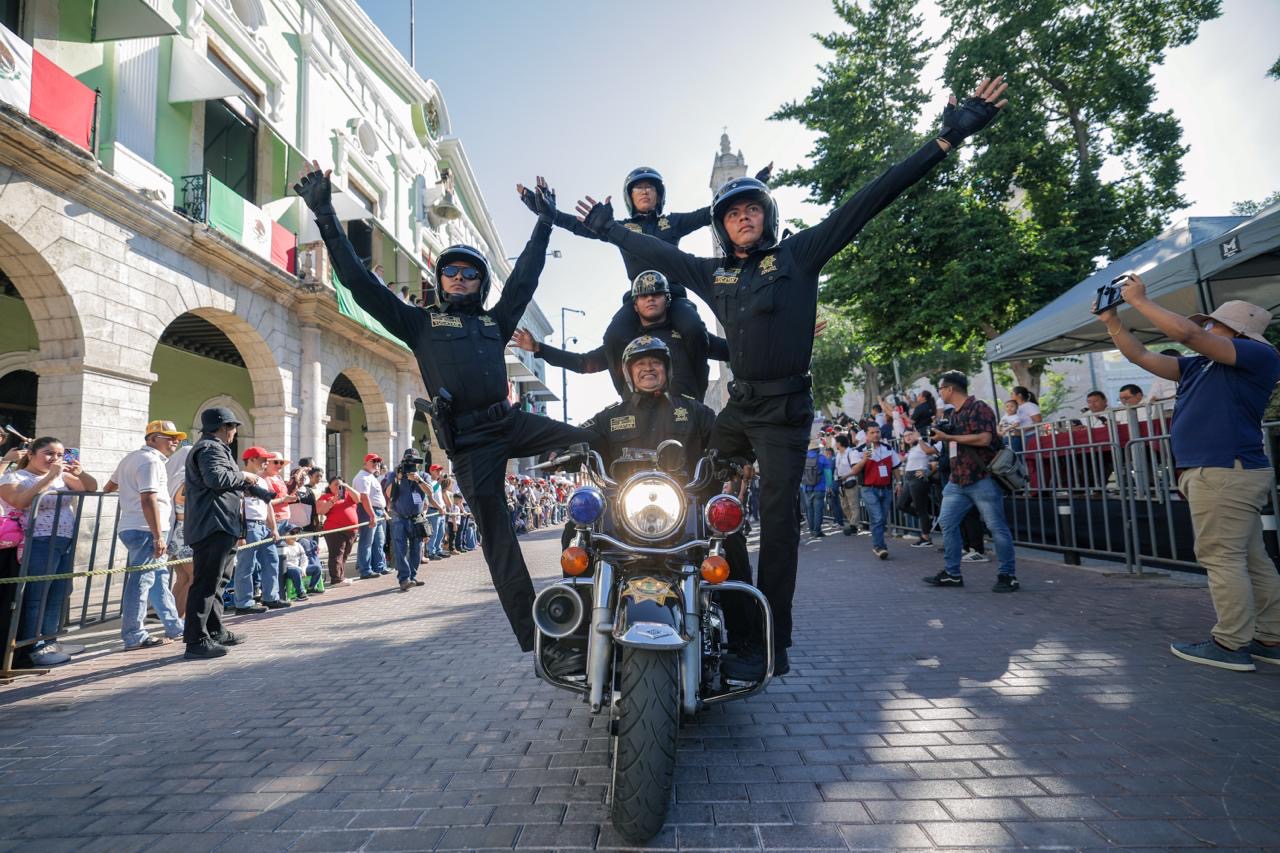 Desde el balcón central de Palacio de Gobierno, el mandatario estatal disfrutó, junto a las familias yucatecas, la muestra de gallardía, marcialidad y disciplina a cargo de efectivos de instituciones de seguridad, así como agrupaciones escolares.