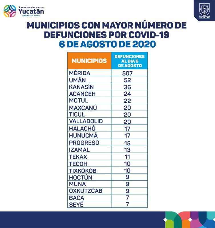 Por otro lado, los municipios son mayor número de defunciones, hasta el corte del 06 de agosto, son: Mérida, con 507, Umán, 52, Kanasín, 36, Acanceh, 24, Motul, 22, Maxcanú, 20, Ticul, 20, Valladolid, 20, Halachó, 17, Hunucmá, 17, Progreso, 15, Izamal, 13,Tekax, 11 Tecoh, 10, Tixkokob,10, Hoctún, nueve, Muna, nueve, Oxkutzcab, nueve, Baca, siete, Seyé, siete.