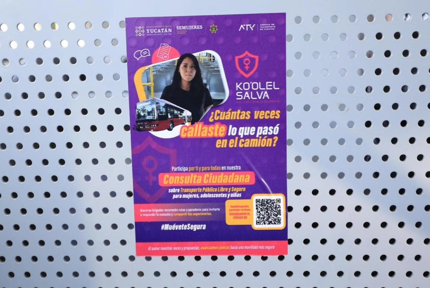 Como parte de la estrategia Espacios Seguros Ko’olel Salva, que impulsa el gobierno del estado, la Agencia de Transporte de Yucatán (ATY), la Secretaría de las Mujeres (Semujeres) y la Secretaría de Seguridad Pública (SSP) realizan una Consulta Ciudadana para conocer las opiniones de las usuarias del servicio público con la finalidad de fortalecer acciones de prevención y atención frente a la violencia.