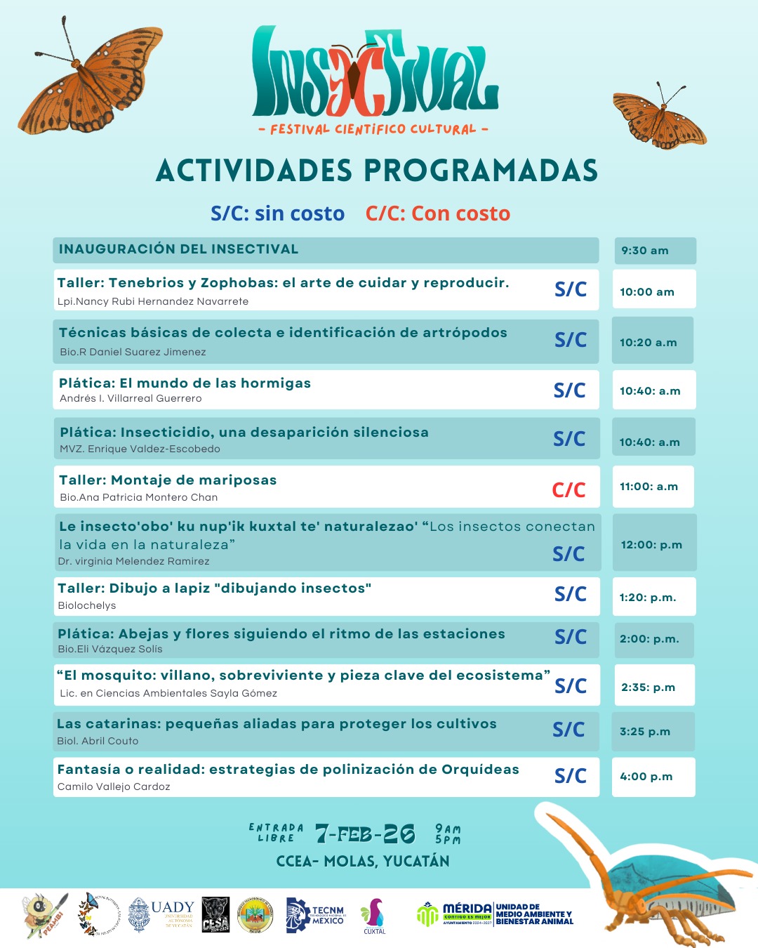 Únicamente el taller de Montaje de Mariposas, que requiere material especial, tiene un costo de 650 pesos y contará con cupo limitado, mientras que el resto de las actividades son gratuitas.