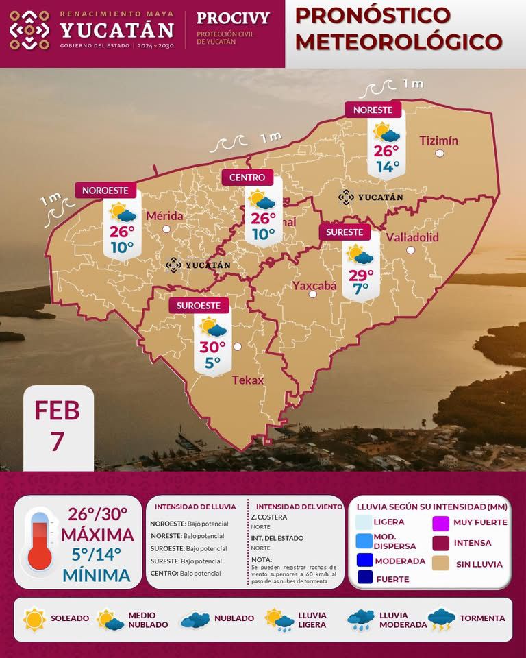 Protección Civil Yucatán (Procivy) informó que para este sábado 7 de febrero, la masa de aire polar que prevalece en la región, favorecerá con tiempo estable sobre el estado de Yucatán, manteniendo el ambiente de fresco a cálido en el día y frío por la noche y el amanecer.