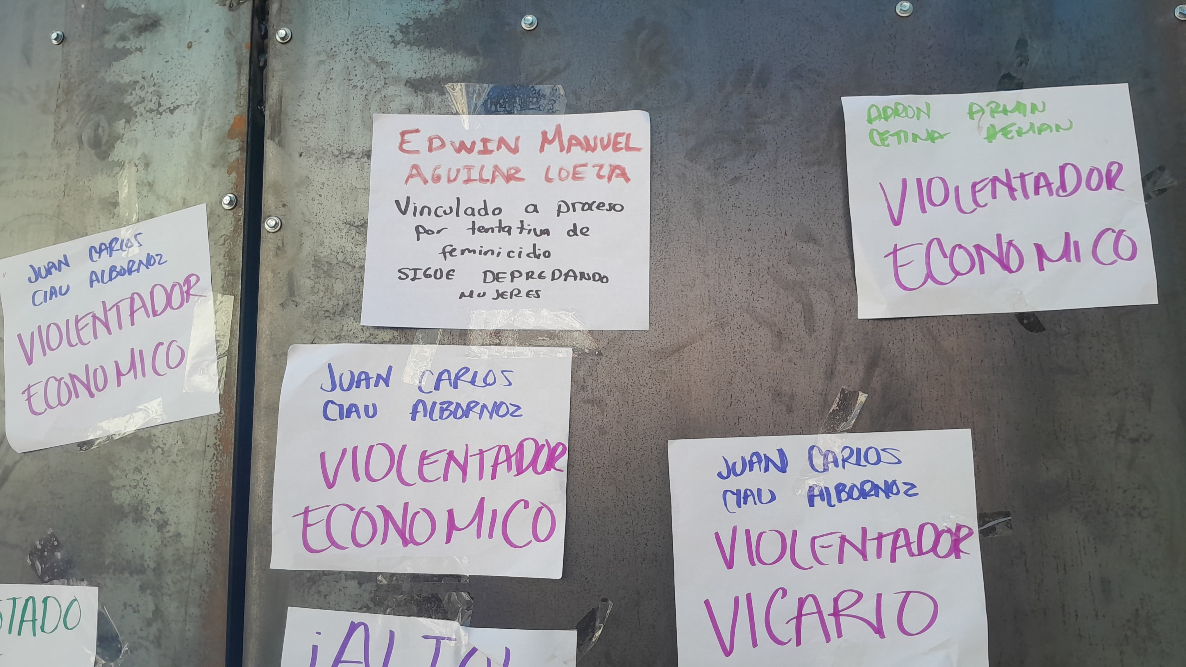 El pequeño grupo también exhibió los nombres de hombres agresores y violentadores y destacó la importancia de visibilizar todas las violencias en unión para que las autoridades atiendan todas las exigencias.
