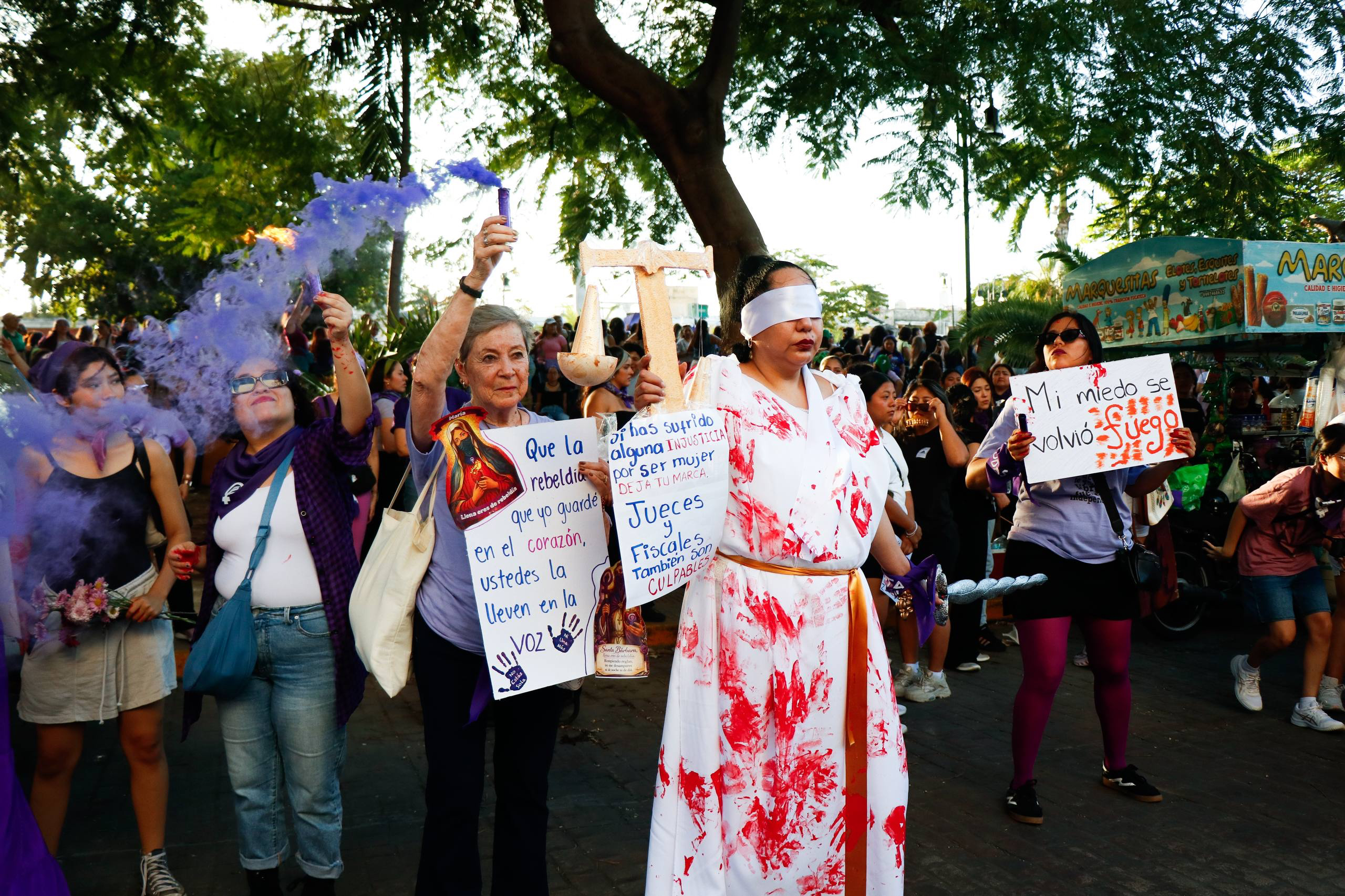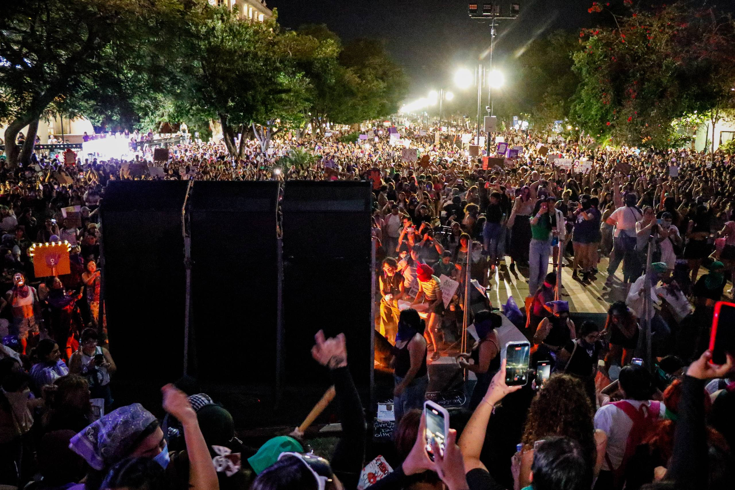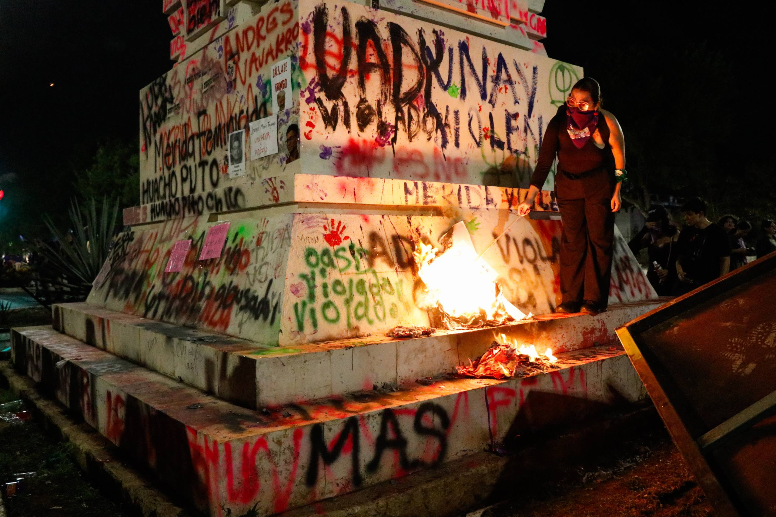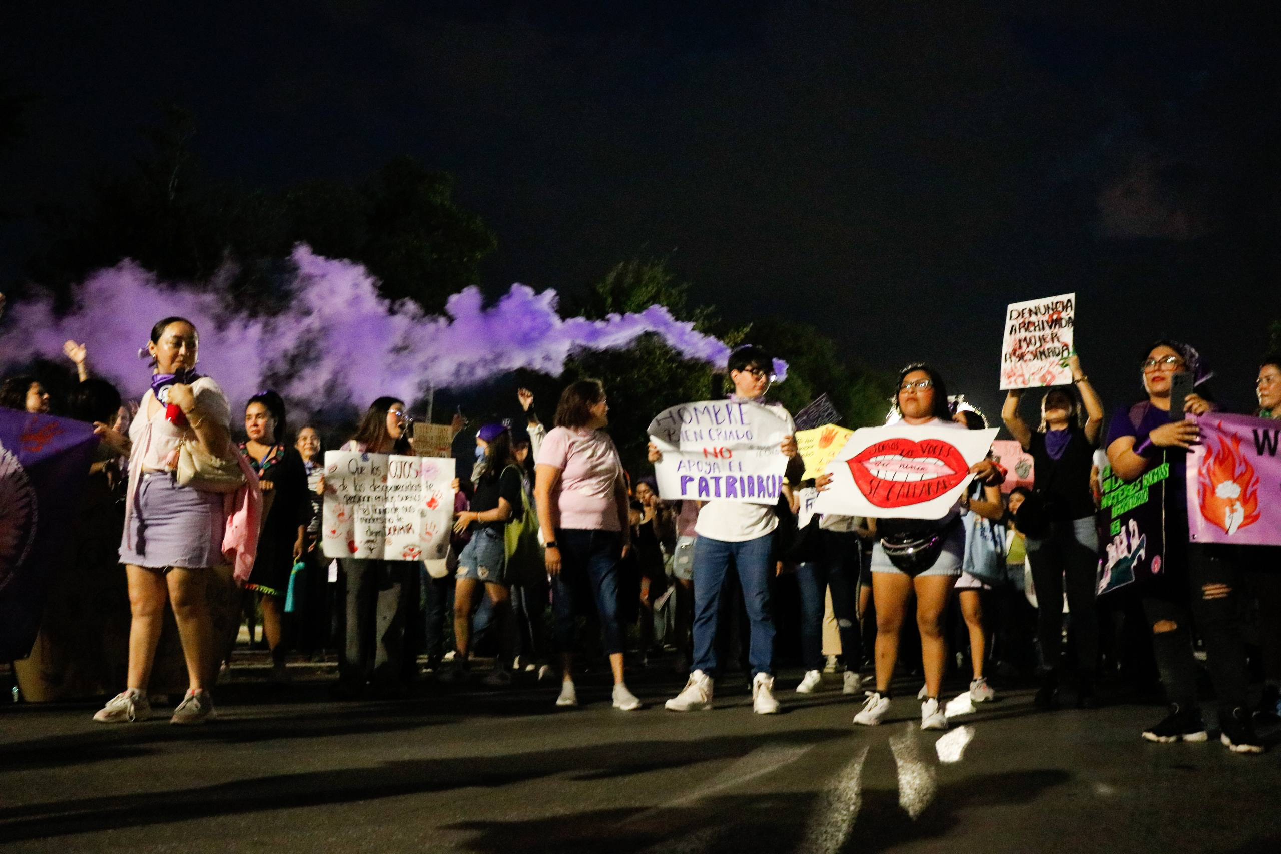 Este 8 de marzo el rojo cambió por morado. La bandera mexicana fue intervenida y ondeó desde lo más alto del Monumento a la Patria tras una irrupción de manifestantes que participaron en la protesta por el Día Internacional de la Mujer en Mérida.