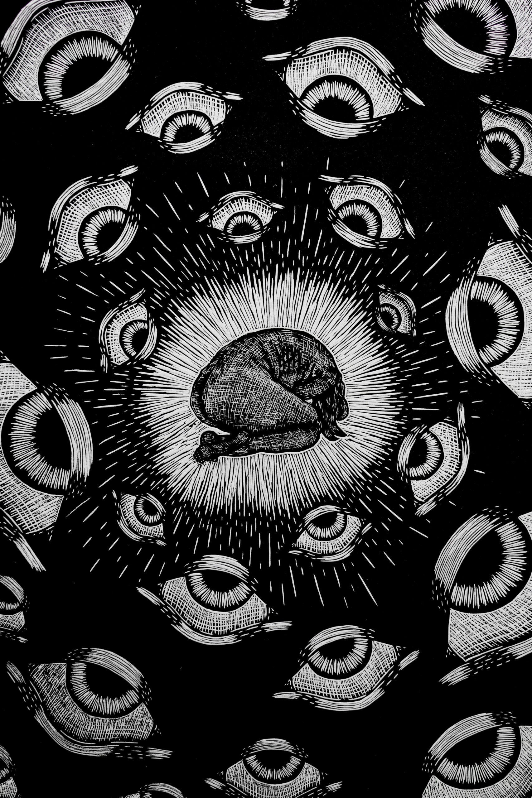 “La obra sugiere experiencias de acoso y sus posibles secuelas, mediante imágenes simbólicas que se complementan con texturas y contrastes de blanco y negro. Las piezas gráficas invitan al espectador a reflexionar y empatizar sobre las situaciones que enfrentan muchas deportistas”, señala la invitación a la inauguración.