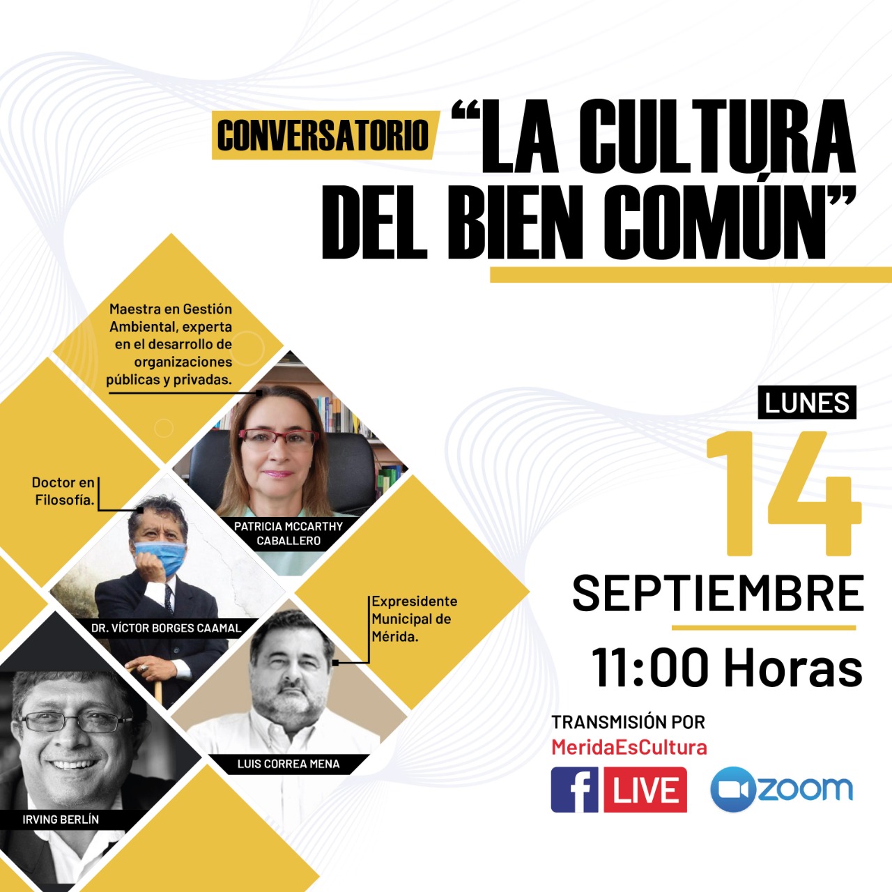 El próximo lunes 14 de septiembre se realizará el conversatorio “La cultura del bien común”, que se transmitirá a través de la página de Facebook Mérida es Cultura, a partir de las 11 de la mañana.