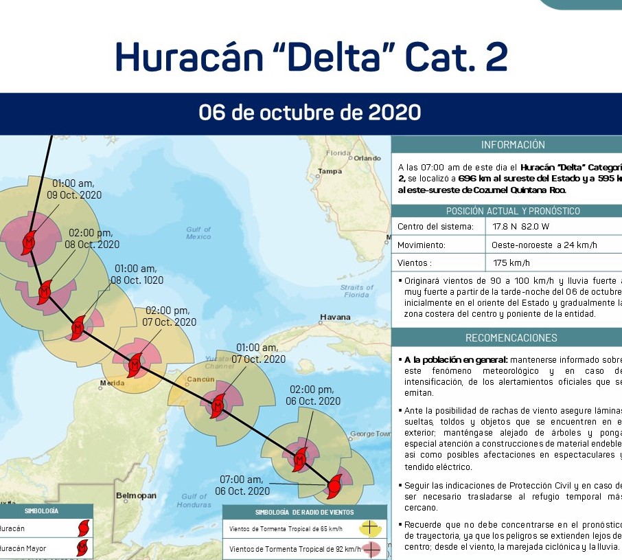 Durante la madrugada de este martes, el huracán Delta tomó fuerza y se intensificó a categoría 2. A las 7 horas el meteoro se localizaba a 696 km al sureste de Yucatán, desplazándose hacia el oeste-noroeste a una velocidad de 24 km/h con vientos de 175 km/h y rachas de 185 km/h, según informó la Coordinación Estatal de Protección Civil.