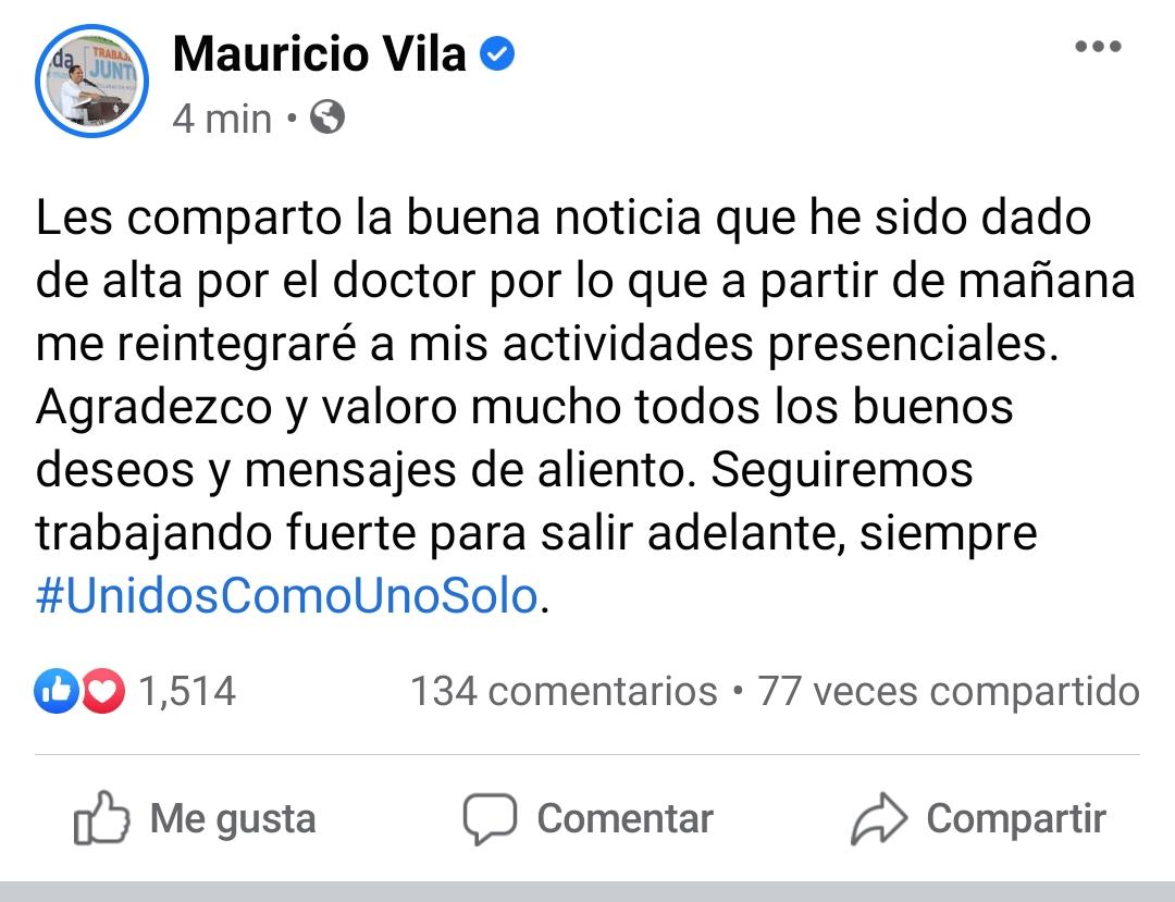 “Les comparto la buena noticia que he sido dado de alta por el doctor por lo que a partir de mañana me reintegraré a mis actividades presenciales” anunció el mandatario a través de sus redes sociales.