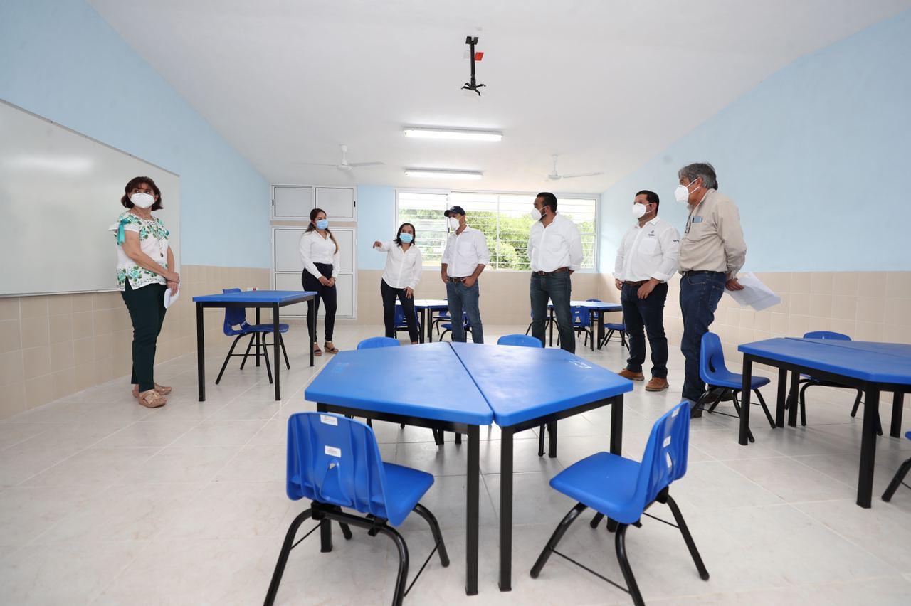 En la escuela preescolar “Kinich Kakmó”, Vila Dosal recorrió una nueva aula didáctica equipada con equipo audiovisual, que se construyó y preparó a través de dichos esquemas para que, cuando las condiciones de la pandemia del Coronavirus lo permitan y vuelvan a las clases presenciales, los alumnos y maestros de escuelas públicas del estado cuenten con muebles nuevos, más seguros y cómodos.