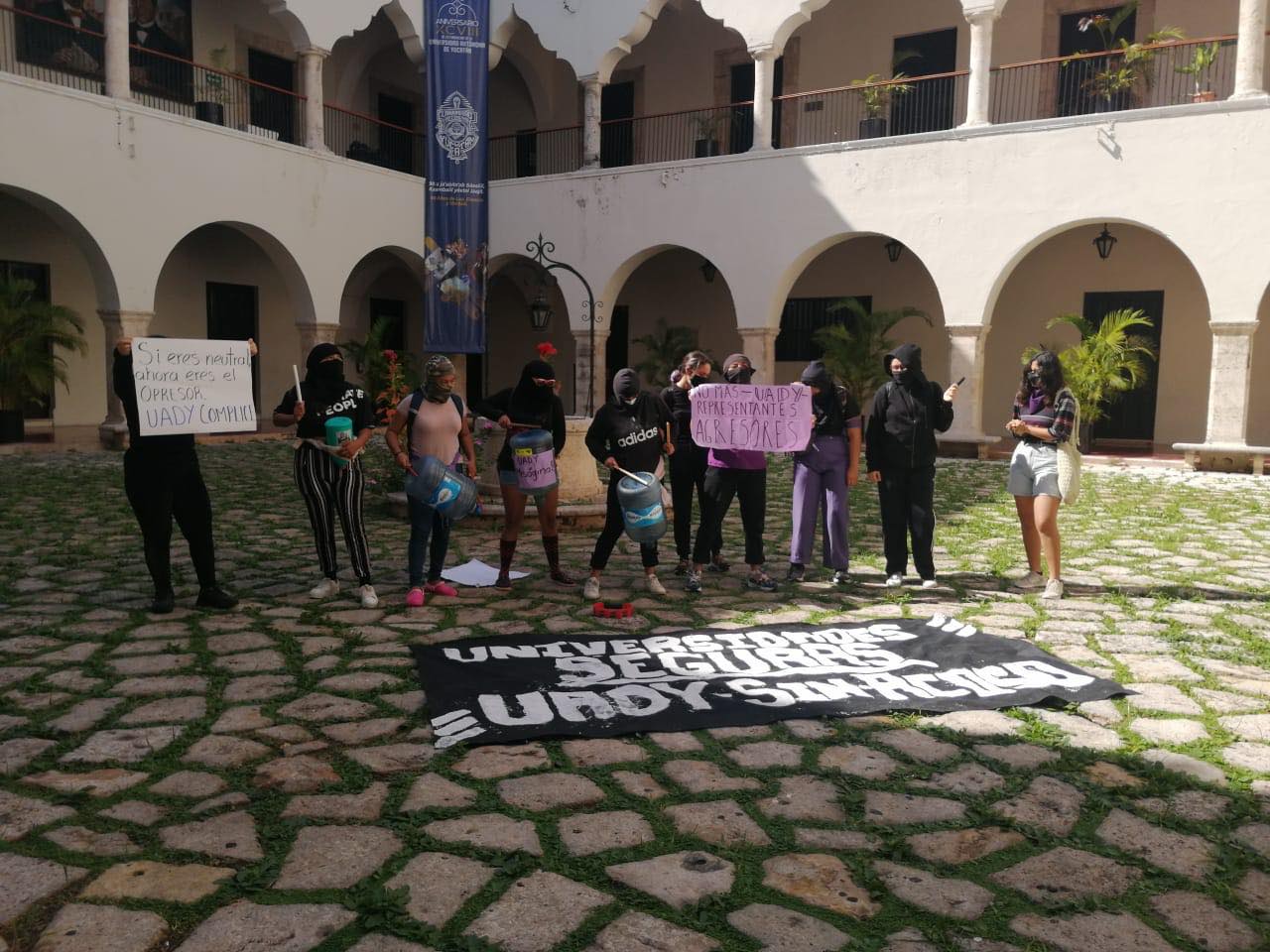 Con pancartas con leyendas como “No más representantes agresores”, “Si eres neutral, ahora eres el opresor. UADY cómplice", “Universidades seguras”; las mujeres se instalaron en las puertas de la sede central de la institución educativa, así como en el interior de la misma, lanzando consignas con ayuda de batucadas, exigieron espacios libres de violencia.