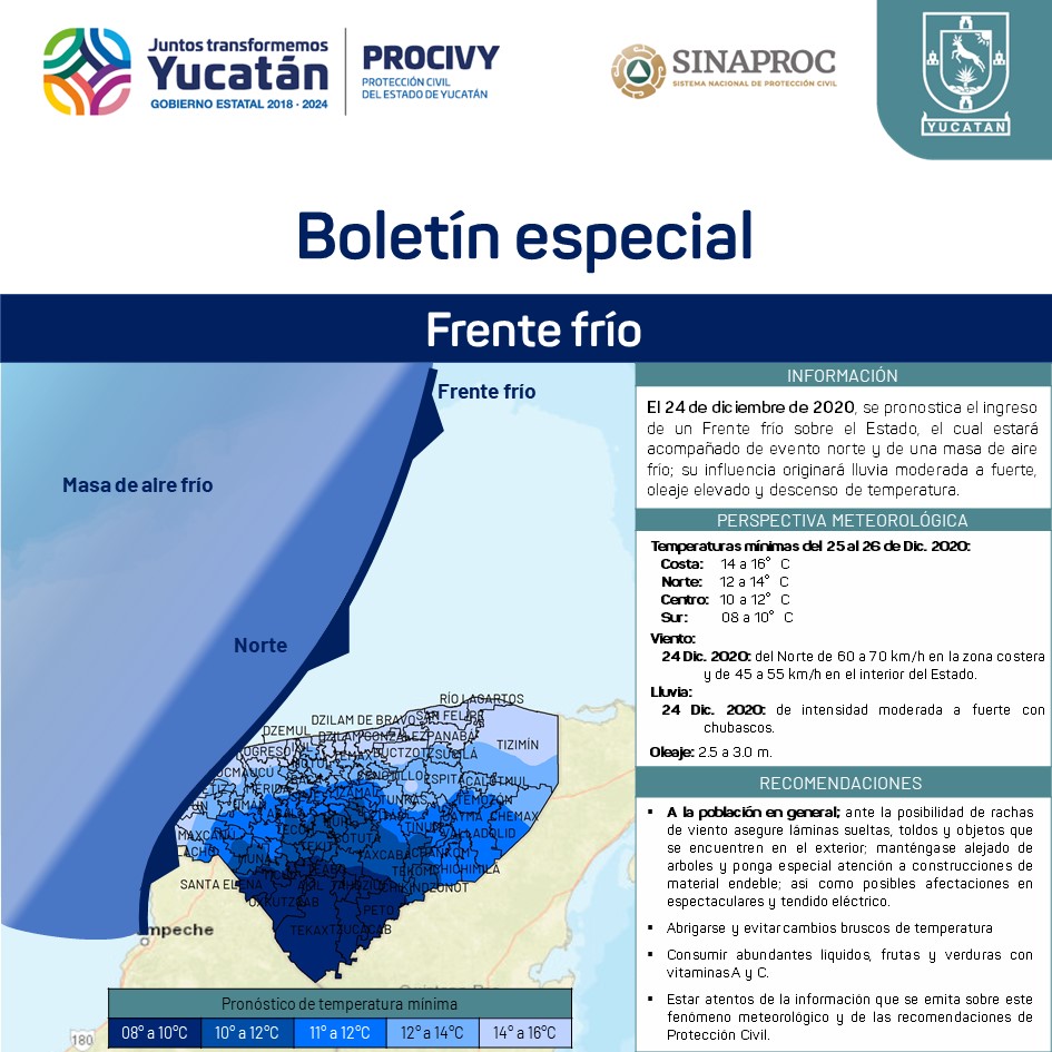 Según el Centro Estatal de Monitoreo y Alertamiento de la dependencia, se espera que dicho fenómeno ingrese a Yucatán el jueves 24 de diciembre, lo que propiciará lluvias de moderadas a fuertes, descenso de temperatura, incremento en el oleaje y vientos de 60 a 70 kilómetros por hora en la zona costera.