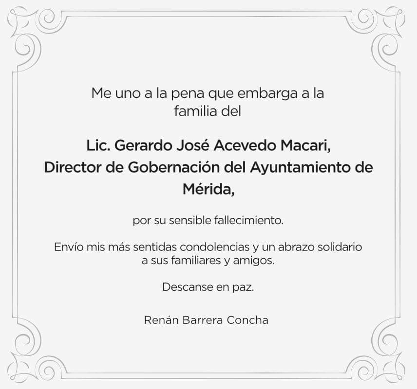 El ayuntamiento de Mérida informó sobre el fallecimiento de Gerardo José Acevedo Macari, quien se desempeñó como director de Gobernación en la administración que encabeza el alcalde Renán Barrera Concha.