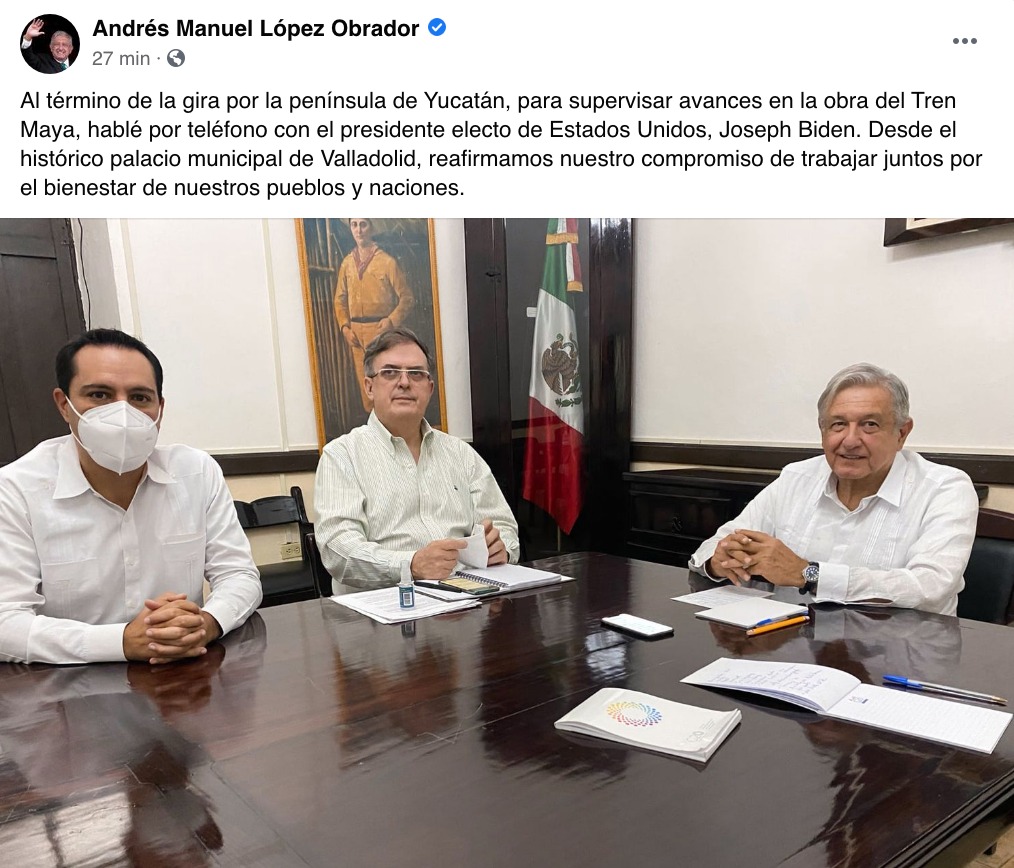 “Desde el histórico ayuntamiento de Valladolid, Yucatán, he conversado por teléfono con el presidente electo de Estados Unidos, Joseph Biden”, reza parte del texto.