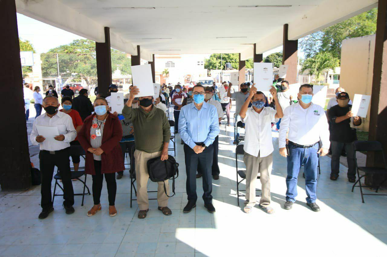 En representación del gobernador Mauricio Vila Dosal, el subsecretario de Desarrollo Social y Asuntos Religiosos, Víctor Hugo Lozano Poveda, realizó la entrega de 43 títulos de propiedad a habitantes en domicilios ubicados en las comisarías de Komchén, Chablekal, Cosgaya, Kikteil, Sac Nicté y Sierra Papacal.