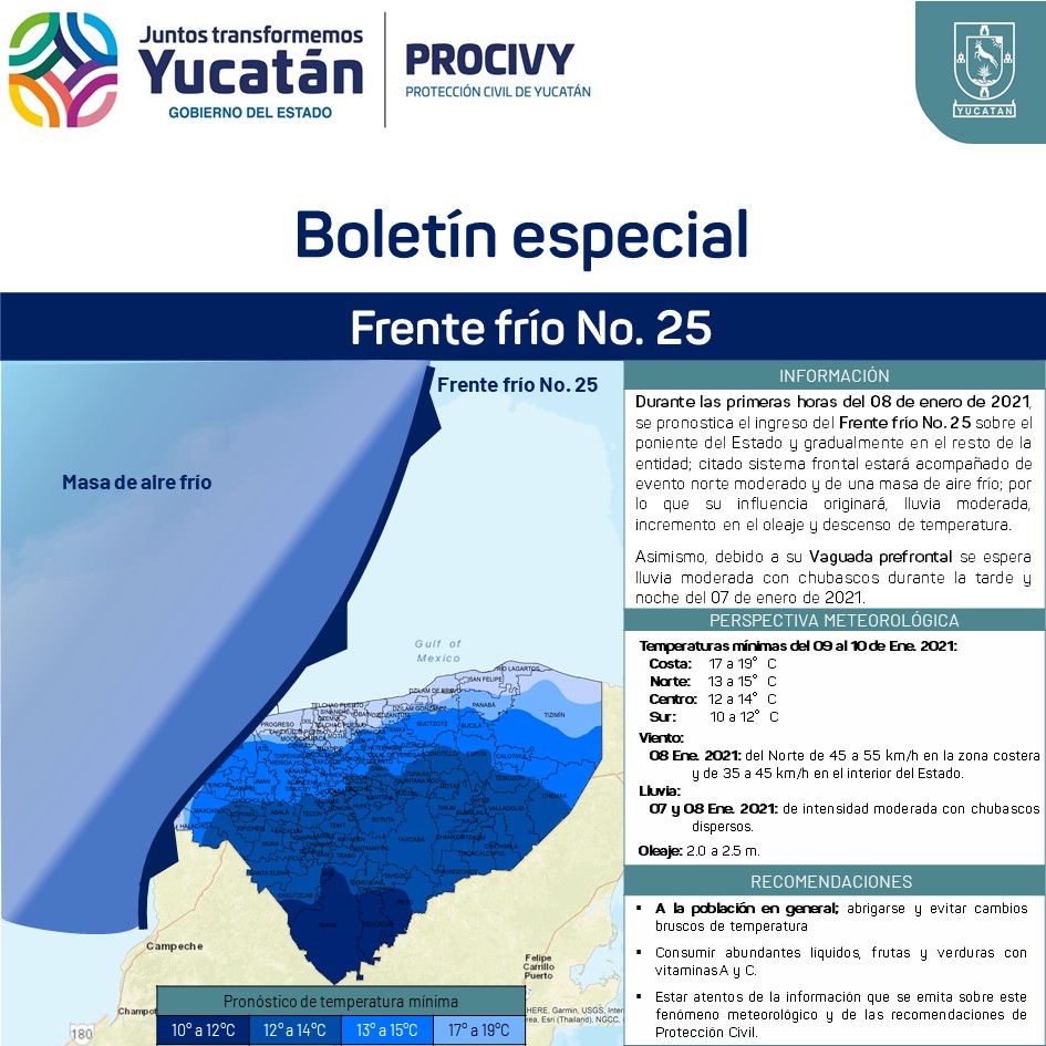Ante el ingreso del frente frío número 25 en las primeras horas del 8 de enero, que provocará mínimas de 10 a 12 grados para el sur de la entidad, por instrucción del gobernador Mauricio Vila Dosal, la Coordinación Estatal de Protección Civil (Procivy) recomienda a la población abrigarse y evitar cambios bruscos de temperatura.