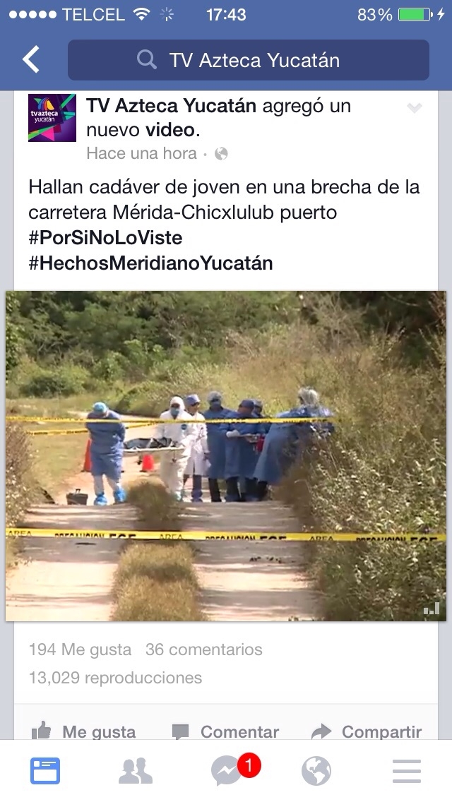 Alrededor de las 6:30 de la mañana fue hallado, en una brecha de la carretera Mérida-Chicxlulub Puerto por el kilómetro 3.4, el cuerpo sin vida de una joven de 18 años quien llevaba dos días reportada como desaparecida, según reportó TV Azteca Yucatán en su programación del día de hoy.