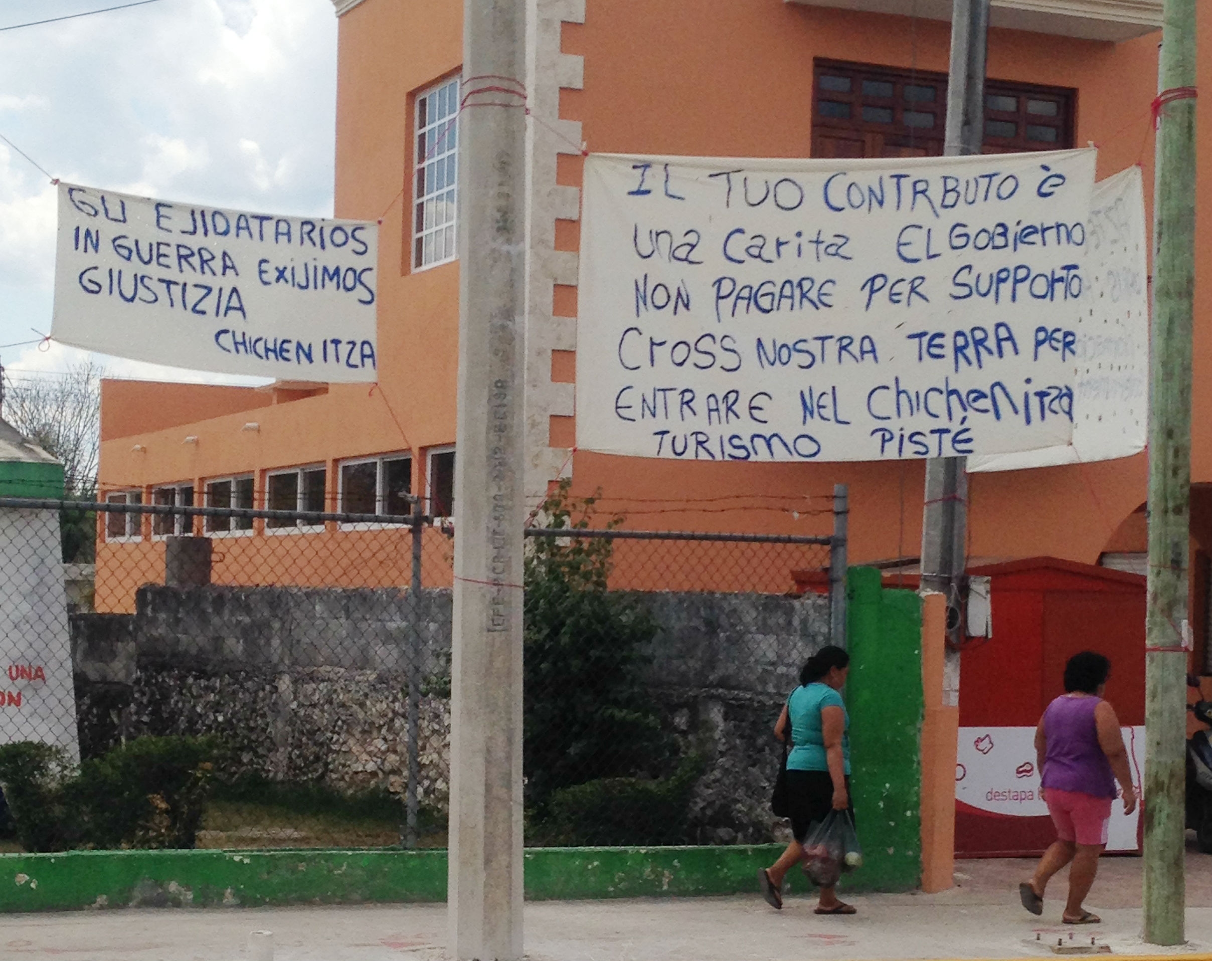 Señaló que el problema existe porque Cultur utiliza una zona ejidal, donde tienen restaurantes, estacionamientos y locales para artesanos y comercios, espacio que pertenece a 400 ejidatarios, quienes piden que se les permita instalar una pluma para cobrar una cuota de recuperación a los automovilistas que entran en esa zona, y así poder subsidiar los ejidos, pues no pueden utilizarlos como tales por ser parte del parador turístico de Chichén Itzá.