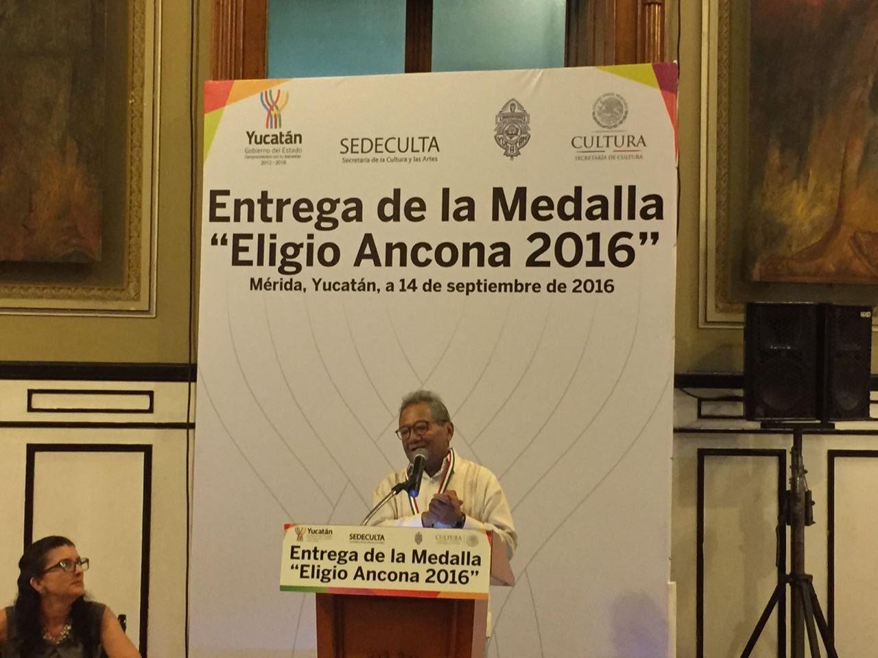 El compositor yucateco Armando Manzanero recibió la medalla Eligio Ancona 2016, de las manos del gobernador Rolando Zapata Bello, mientras el público en el Salón de la Historia del Palacio de Gobierno aplaudió al maestro.