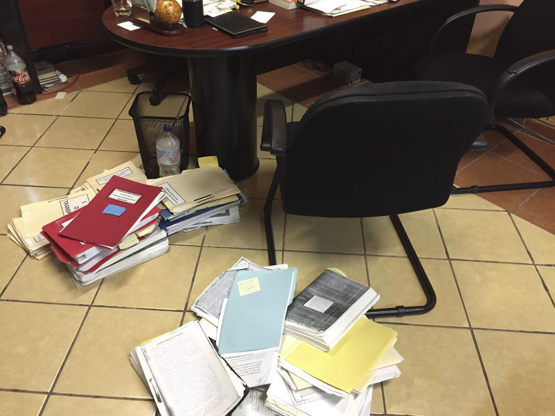 Asimismo, los archiveros habían sido revueltos y, en el área donde trabajan los pasantes, fueron robadas tres computadoras. También se llevaron la computadora de la recepcionista y una portátil que estaba en la oficina particular de Medina Escobedo.