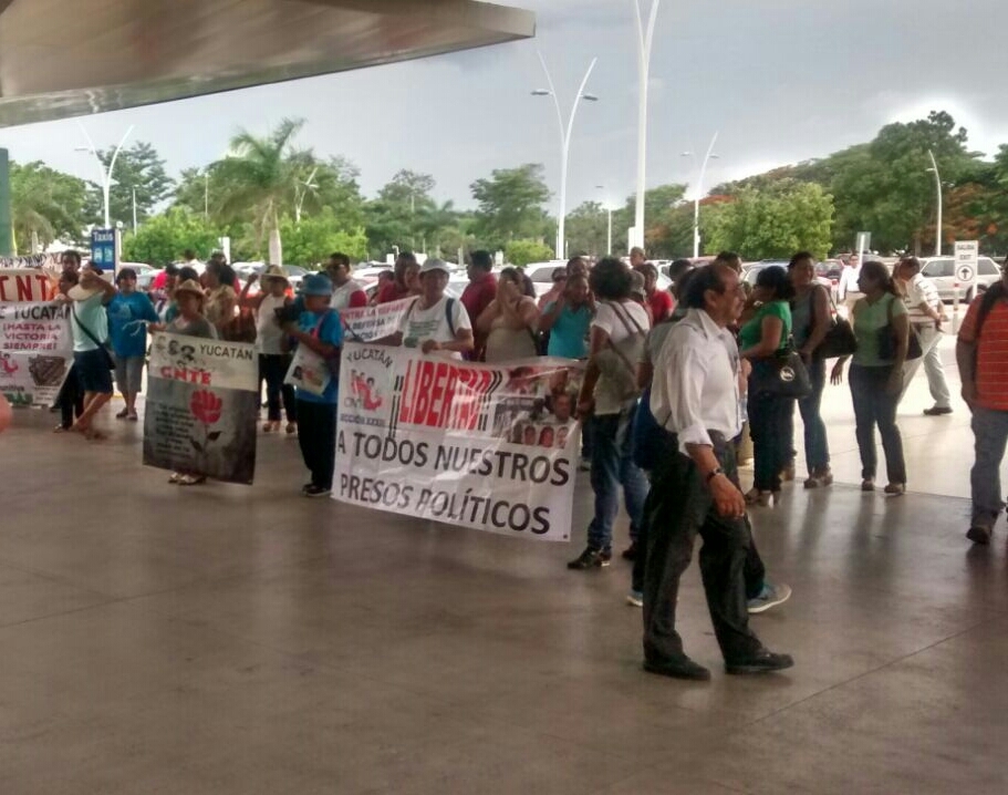 Alrededor de 300 maestros, de la Coordinadora Nacional de Trabajadores de la Educación se manifestaron a las afueras del aeropuerto internacional de Mérida, como parte de la jornada nacional en apoyo a la Sección 22 y en repudio de la Reforma Educativa.