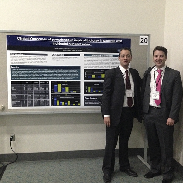 En el Congreso Anual, los doctores Alexander Heinze Rodríguez y Miguel Villalobos-Gollás, del área de urología del HRAE, presentaron los trabajos Análisis de  complicaciones de nefrolitotomía percutánea en pacientes con insuficiencia renal  y  Resultados de nefrolitotomía percutánea en pacientes con orina purulenta incidental, respectivamente.