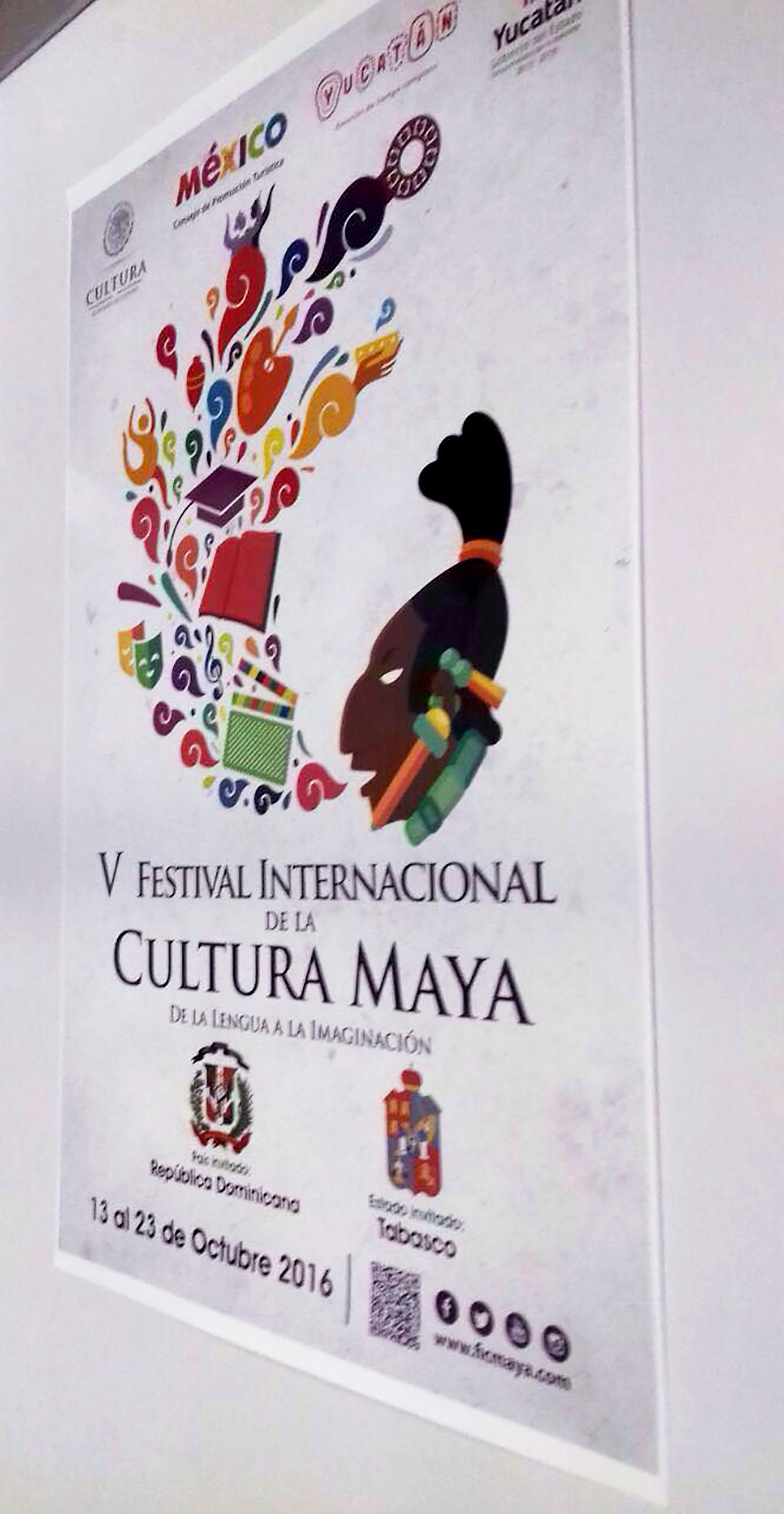 El póster oficial del FICMaya, mostrado en varios stands de la Semana de Yucatán en México, a pesar de la ausencia de Jorge Esma Bazan, director del Festival, muestra a los lugares invitados y el tema de la quinta edición, "De la lengua a la imaginación". El cartel presenta a un hombre maya hablando y de su boca surgen libros y el símbolo de la lengua.